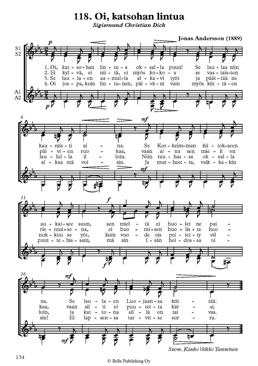 - Oscar Ahnfelt (arr. Juha Hakulinen): Oi katsohan lintua