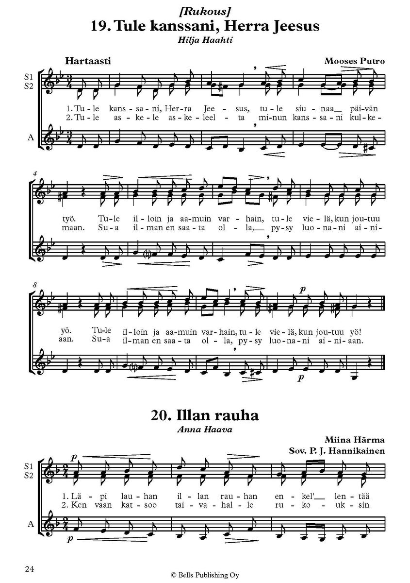 Hengellisiä lauluja sopraano- ja alttoäänille ('Sacred songs for soprano and alto voices') offers a versatile selection of spiritual music for three- and four-part descant choirs (SSA and SSAA). This sheet music collection is perfect for children's and women's choirs.